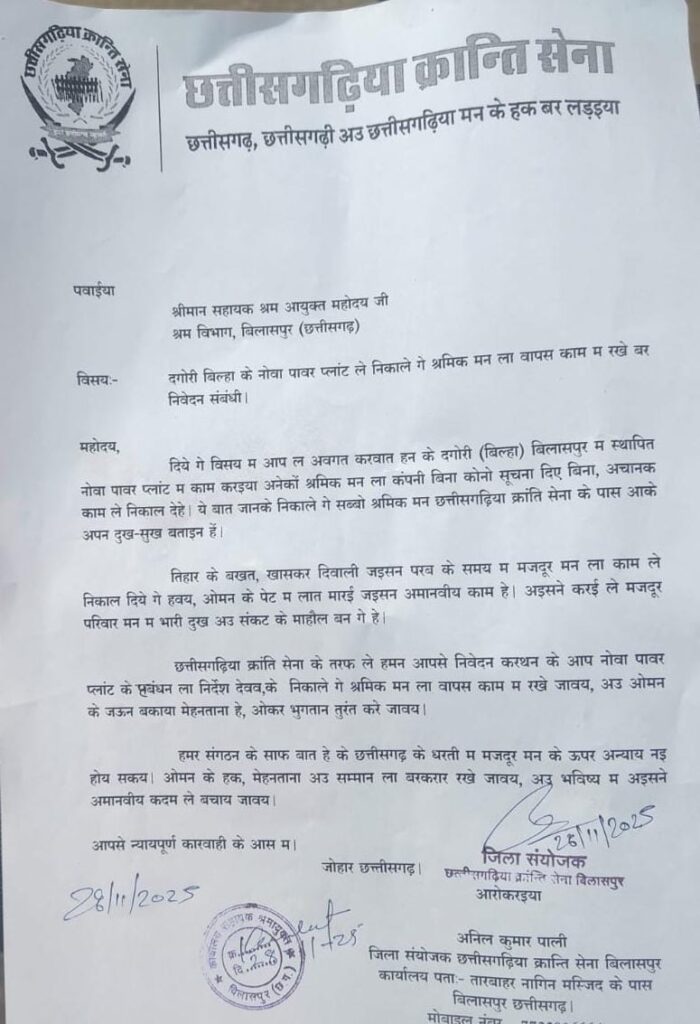 बिलासपुर। दगोरी स्थित पावर प्लांट से अचानक काम से निकाले गए मजदूरों के समर्थन में आज छत्तीसगढ़िया क्रांति सेना ने जिला कलेक्टर बिलासपुर को लिखित शिकायत सौंपकर कड़ा विरोध दर्ज कराया।