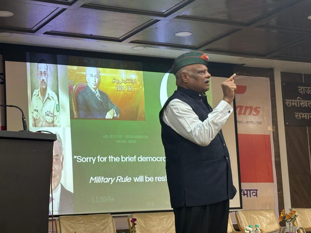 मुख्य वक्ता मेजर जनरल अनूज माथूर (प्रभारी पश्चिम क्षेत्र, Fans) ने कहा कि पाकिस्तान की बुनियाद ही झूठ पर रखी गई है। बलूचिस्तान और खैबर-पख्तून जैसे क्षेत्रों पर वह बलपूर्वक कब्जा जमाए हुए है। उन्होंने कहा कि पाकिस्तान में हालिया घटनाक्रम बताते हैं कि सेना सरकार से ऊपर हो चुकी है। 27वें संविधान संशोधन के बाद सेना प्रमुख जनरल मुनीर प्रधानमंत्री से अधिक शक्तिशाली हो गए हैं।