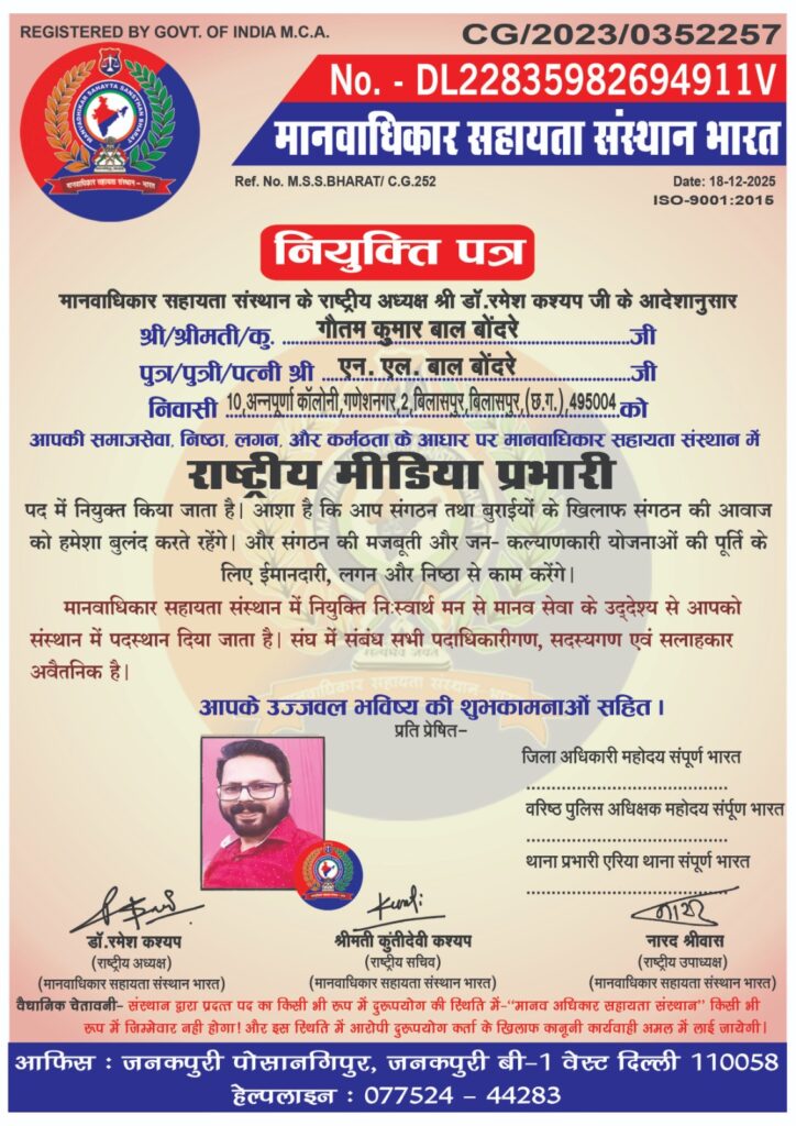 मानवाधिकार सहायता संस्थान भारत ने संगठन की विचारधारा, मूलभूत सिद्धांतों और मानवता के प्रति समर्पित सेवा भाव को और अधिक सशक्त करते हुए एक महत्वपूर्ण निर्णय लिया है। राष्ट्रीय अध्यक्ष डॉ रमेश कश्यप के आदेशानुसार, छत्तीसगढ़ प्रभारी कुमार राज कश्यप की अनुशंसा एवं प्रदेश अध्यक्ष धरम भार्गव की सहमति से गौतम बालबोंदरे को प्रदेश स्तर मीडिया प्रभारी से पदोन्नत कर राष्ट्रीय मीडिया प्रभारी की जिम्मेदारी सौंपी गई है।