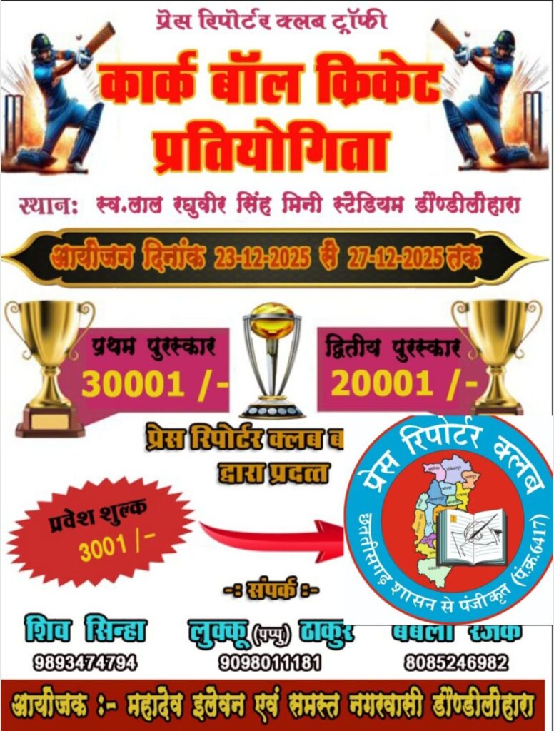 рдмрд╛рд▓реЛрджредрдЫрддреНрддреАрд╕рдЧрдврд╝ рдХреЗ рдмрд╛рд▓реЛрдж рдЬрд┐рд▓реЗ рдХреЗ рдЖрджрд┐рд╡рд╛рд╕реА рдЕрдВрдЪрд▓ рдореЗрдВ рд╕реНрдерд┐рдд рдбреМрдВрдбреАрд▓реЛрд╣рд╛рд░рд╛ рдирдЧрд░ рдкрдВрдЪрд╛рдпрдд рдПрдХ рдРрддрд┐рд╣рд╛рд╕рд┐рдХ, рдкреНрд░реЗрд░рдгрд╛рджрд╛рдпреА рдФрд░ рдЬрдирд╕рд░реЛрдХрд╛рд░ рд╕реЗ рдЬреБрдбрд╝реЗ рднрд╡реНрдп рдЖрдпреЛрдЬрди рдХрд╛ рд╕рд╛рдХреНрд╖реА рдмрдирдиреЗ рдЬрд╛ рд░рд╣реА рд╣реИред рдЦреЗрд▓ рдХреЗ рдорд╛рдзреНрдпрдо рд╕реЗ рд╕рд╛рдорд╛рдЬрд┐рдХ рдЪреЗрддрдирд╛, рдпреБрд╡рд╛ рдКрд░реНрдЬрд╛ рдФрд░ рд╕рдХрд╛рд░рд╛рддреНрдордХ рд╕реЛрдЪ рдХреЛ рдирдИ рджрд┐рд╢рд╛ рджреЗрдиреЗ рд╡рд╛рд▓рд╛ рдХреНрд░рд┐рдХреЗрдЯ рдорд╣рд╛рд╕рдВрдЧреНрд░рд╛рдо 23 рджрд┐рд╕рдВрдмрд░ (рдордВрдЧрд▓рд╡рд╛рд░) рд╕реЗ 27 рджрд┐рд╕рдВрдмрд░ (рд╢рдирд┐рд╡рд╛рд░) рддрдХ рдкреВрд░реЗ рдЙрддреНрд╕рд╛рд╣, рдЧрд░рд┐рдорд╛ рдФрд░ рднрд╡реНрдпрддрд╛ рдХреЗ рд╕рд╛рде рдЖрдпреЛрдЬрд┐рдд рдХрд┐рдпрд╛ рдЬрд╛рдПрдЧрд╛ред