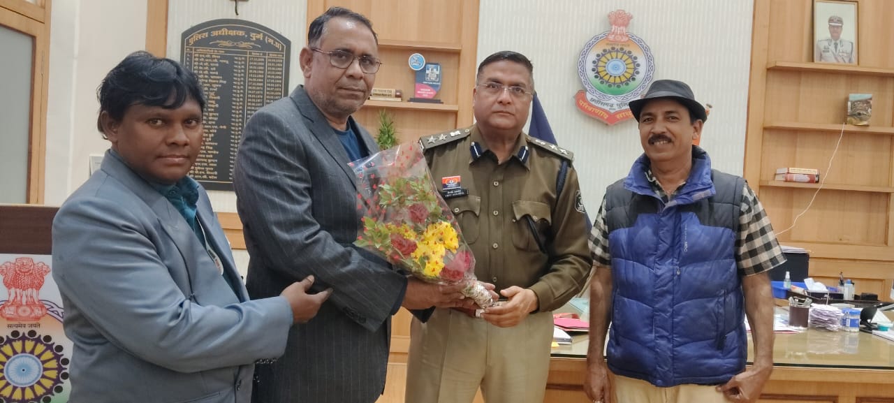 दुर्ग। दुर्ग जिले के पुलिस अधीक्षक विजय अग्रवाल से प्रेस रिपोर्टर क्लब के प्रदेश अध्यक्ष संजय सोनी के नेतृत्व में क्लब पदाधिकारियों की सौजन्य भेंट एवं मुलाकात संपन्न हुई। इस अवसर पर जिले की कानून व्यवस्था, पुलिस प्रशासन की कार्यप्रणाली तथा जनसुरक्षा से जुड़े विभिन्न विषयों पर सार्थक और सकारात्मक चर्चा की गई।