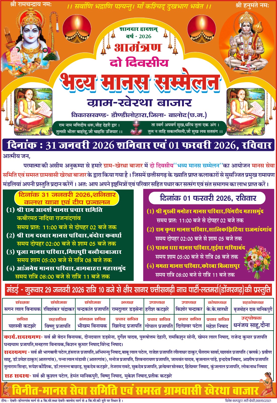 डोंडी लोहरा (बालोद)।ग्राम खेऱया बाजार, विकासखंड डोंडी लोहरा, जिला बालोद में वर्ष 2026 के अवसर पर दो दिवसीय भव्य मानस सम्मेलन का आयोजन किया जा रहा है। यह आयोजन 31 जनवरी 2026 (शनिवार) एवं 01 फरवरी 2026 (रविवार) को संपन्न होगा। कार्यक्रम का आयोजन विनीत मानस सेवा समिति एवं समस्त ग्रामवासी खेऱया बाजार के संयुक्त तत्वावधान में किया जा रहा है।