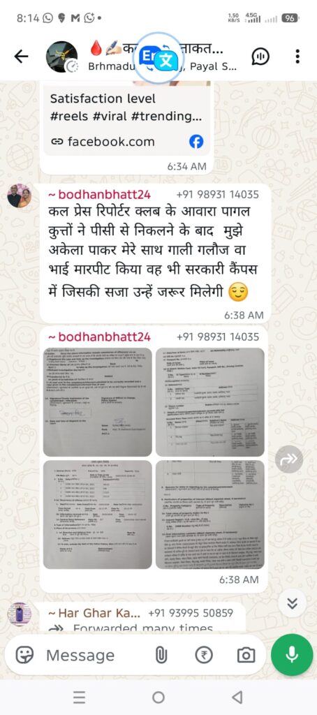 छत्तीसगढ़।प्रेस रिपोर्टर क्लब, छत्तीसगढ़ के प्रदेश अध्यक्ष एवं प्रदेश पदाधिकारियों द्वारा एक महत्वपूर्ण निर्णय लिया गया है। सोशल मीडिया व्हाट्सएप ग्रुप में बोधन भट्ट, निवासी ग्राम पंचायत मालीगुड़ी, जिला बालोद द्वारा प्रेस रिपोर्टर क्लब के सभी सदस्यों को “आवारा पागल कुत्ते” एवं “कुत्ता जैसे” अत्यंत अपमानजनक शब्दों से संबोधित किए जाने के मामले को गंभीरता से लिया गया है।
