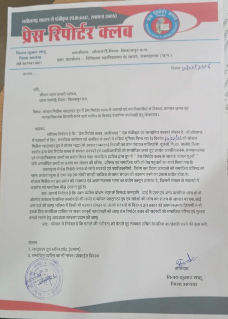 इसी क्रम में सोशल मीडिया व्हाट्सएप ग्रुप में प्रेस रिपोर्टर क्लब के सदस्यों को लेकर अभद्र भाषा का प्रयोग करने वाले बोधन भट्ट, निवासी ग्राम पंचायत मालीघोरी, जिला बालोद के विरुद्ध भी शिकायत पत्र को संलग्न करते हुए कार्रवाई की मांग की गई है। संबंधित व्यक्ति द्वारा संगठन के लिए अत्यंत अमर्यादित एवं अपमानजनक शब्दों का प्रयोग कर प्रेस रिपोर्टर क्लब की गरिमा एवं सामाजिक प्रतिष्ठा को ठेस पहुंचाने का आरोप लगाया गया है।