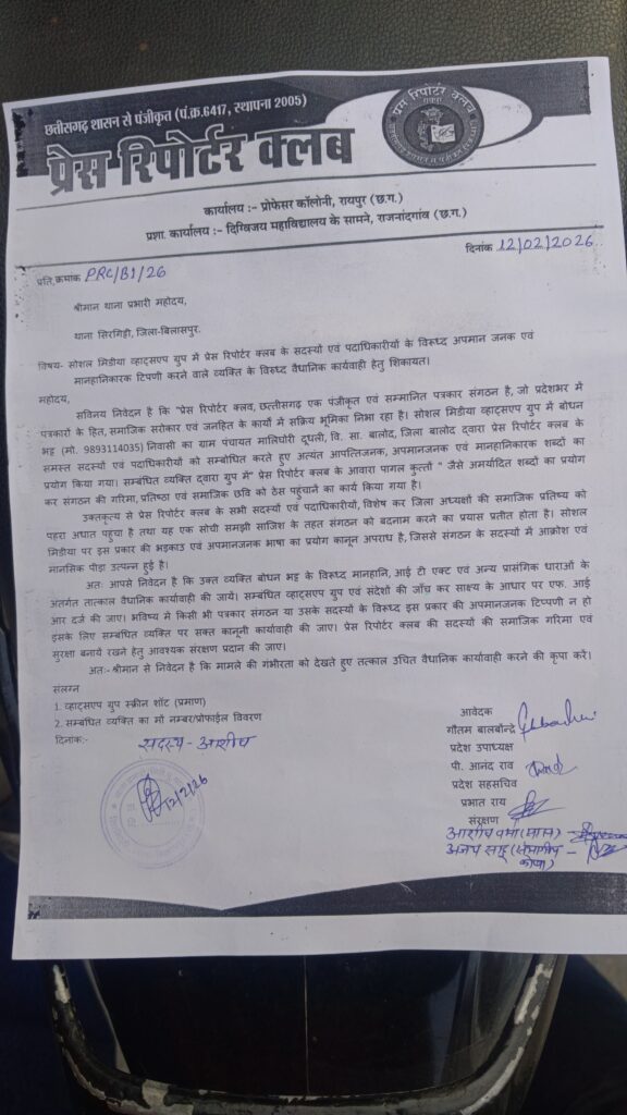 यह शिकायत ग्राम पंचायत मालीगुड़ी, जिला बालोद निवासी बोधन भट्ट पिता गेंदालाल भट्ट द्वारा सोशल मीडिया माध्यम पर प्रेस रिपोर्टर क्लब एवं उसके सदस्यों के प्रति की गई अभद्र एवं अपमानजनक टिप्पणी के विरुद्ध दर्ज कराई गई है। शिकायत पत्र में उल्लेख किया गया है कि उक्त व्यक्ति द्वारा सार्वजनिक मंच पर प्रयोग की गई अनुचित एवं असम्मानजनक भाषा न केवल संगठन की छवि को धूमिल करती है, बल्कि पत्रकार समाज की प्रतिष्ठा को भी ठेस पहुंचाती है।
