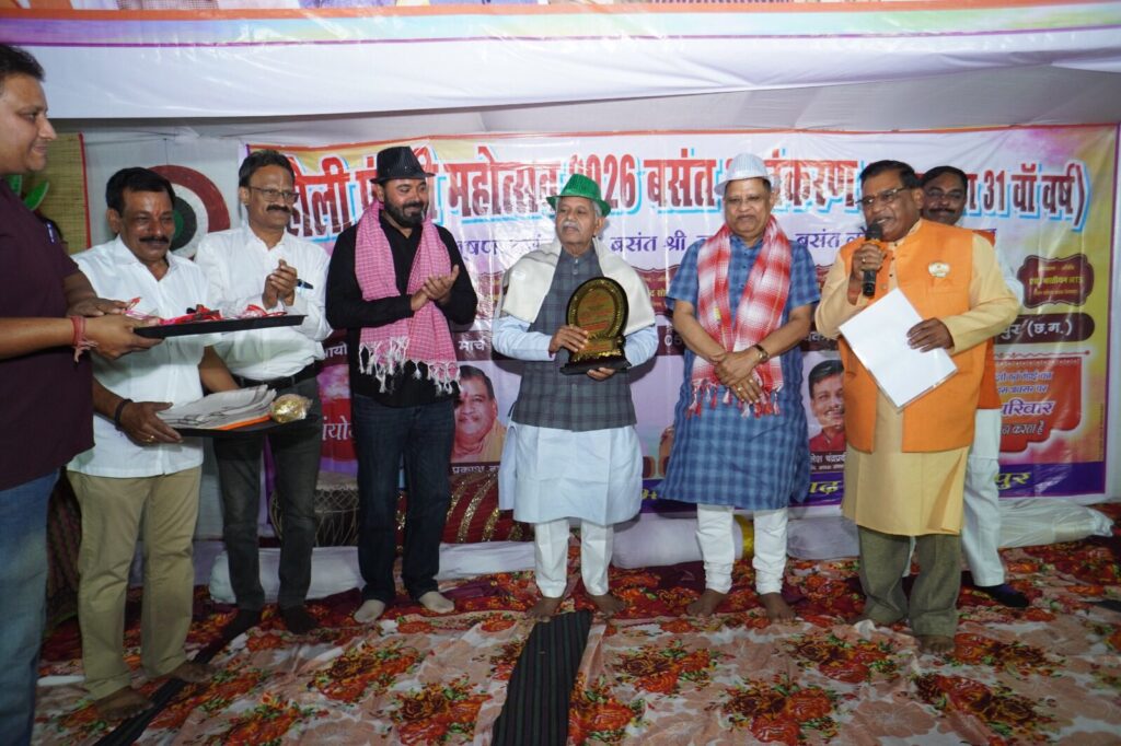 बिलासपुर। होली पंचमी के अवसर पर बेलतरा-सीपत क्षेत्र में आयोजित बसंत महोत्सव कार्यक्रम में विभिन्न क्षेत्रों की विशिष्ट हस्तियों को बसंत अलंकरण से सम्मानित किया गया। इस वर्ष यह सम्मान बिल्हा के वरिष्ठ विधायक एवं पूर्व विधानसभा अध्यक्ष धरमलाल कौशिक, कुलपति प्रो. ए.डी.एन. बाजपेयी, फिल्म निर्माता डॉ. जेठूराम साहू, वरिष्ठ पत्रकार तारिणी शुक्ला तथा मंडल वाणिज्य प्रबंधक एस. भारतीयन को प्रदान किया गया।