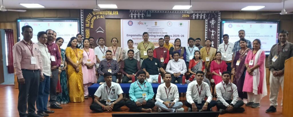बिलासपुर। अटल बिहारी वाजपेयी विश्वविद्यालय में आयोजित राष्ट्रीय सेवा योजना (NSS) कार्यक्रम अधिकारियों के सात दिवसीय प्रशिक्षण के छठे दिन दो महत्वपूर्ण सत्र संपन्न हुए। कार्यक्रम की शुरुआत सरस्वती पूजन और डॉ. नेहा जैन द्वारा पिछले दिन की गतिविधियों के फीडबैक के साथ हुई।